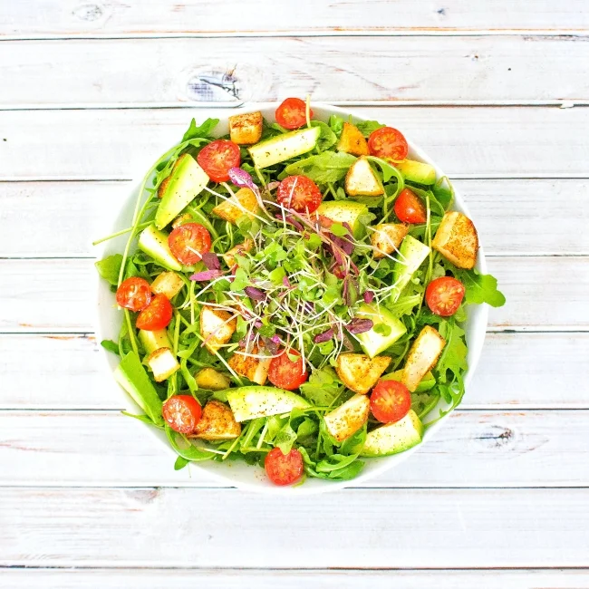 2. Place arugula into a bowl. Slice cherry tomatoes in half and dice avocado. Add potatoes, tomatoes, and avocado to bowl. Top with micro greens, and drizzle with olive oil, white wine vinegar, and juice of lemon.