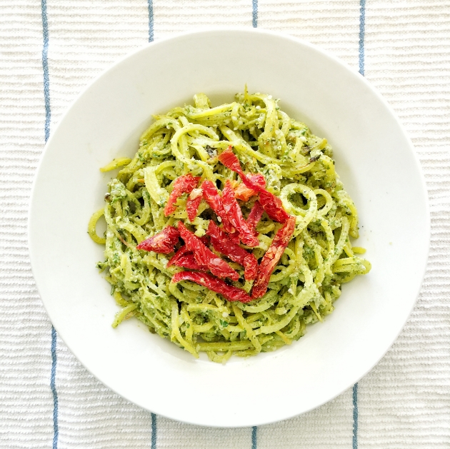 Spiralized Golden Beets with Parsley Walnut Pesto and Sun-dried Tomatoes