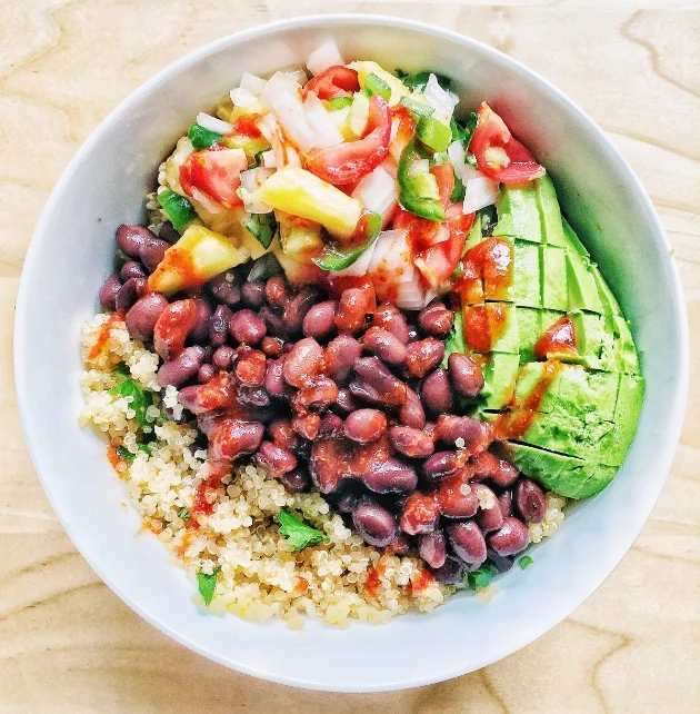 3. Rinse and drain black beans. Top quinoa with black beans, pineapple mixture, and diced avocado. Top with hot sauce as desired.