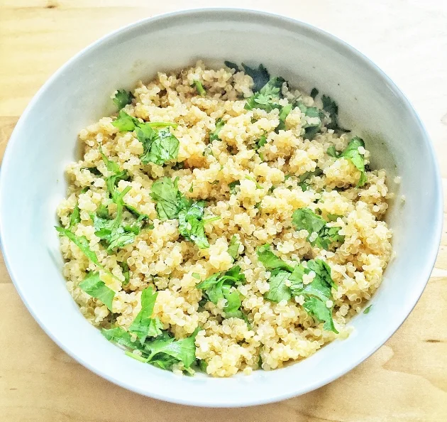 1. In a small to medium bowl, mix quinoa, cilantro, garlic powder, and cumin. Squeeze lime juice over quinoa and drizzle with a little bit of olive oil. Toss and put aside.