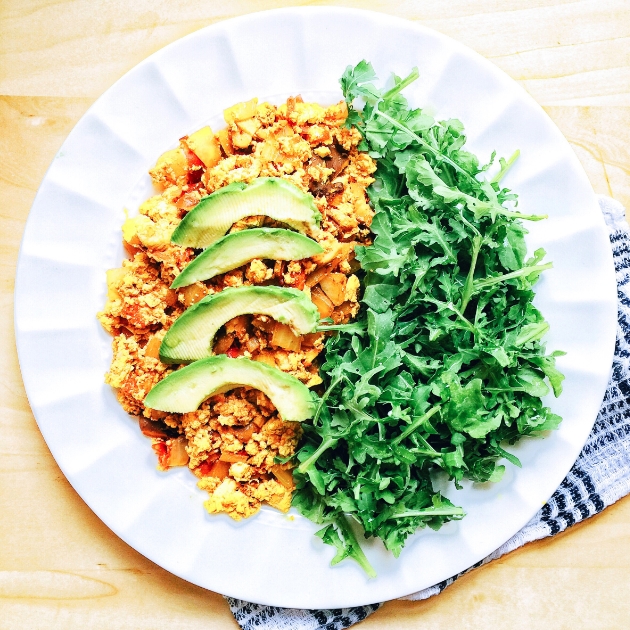 Veggie Tofu Scramble with Avocado and Arugula Salad