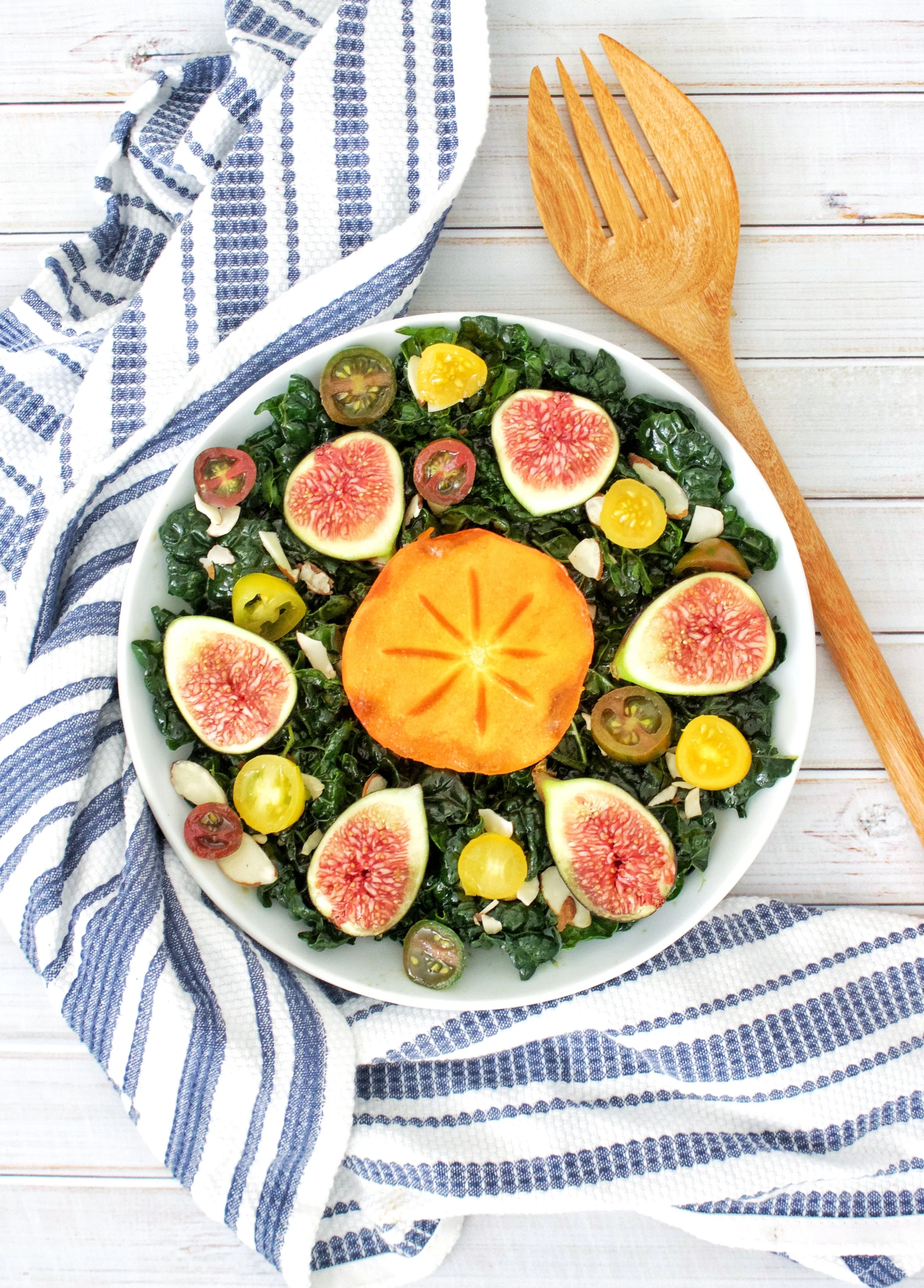 Yes, it's winter, and yes, El Niño has just hit Los Angeles, but here I am making fruity salads as if it was summer. I can't help it though — Sunday afternoon I hit the Brentwood farmer's market and picked up some kale, persimmons, and fresh heirloom tomatoes, and then right after I went over to my friends place in the Pacific Palisades and picked some figs right off her tree! I had to use these fresh little babies right away, so sorry I'm not sorry for making a salad on this rainy, dreary day.