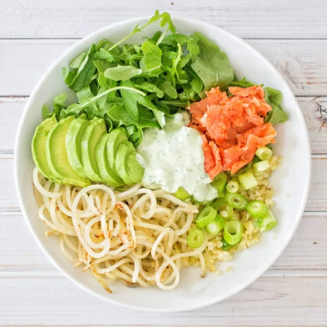 3. When cauliflower is done cooking, add olive oil to the same pan, and heat on medium-low heat. Add potato noodles and cover, cooking for about 6-7 minutes or until potatoes are soft. Add to bowl with cauliflower, along with arugula, avocado, green onion, and smoked salmon.
