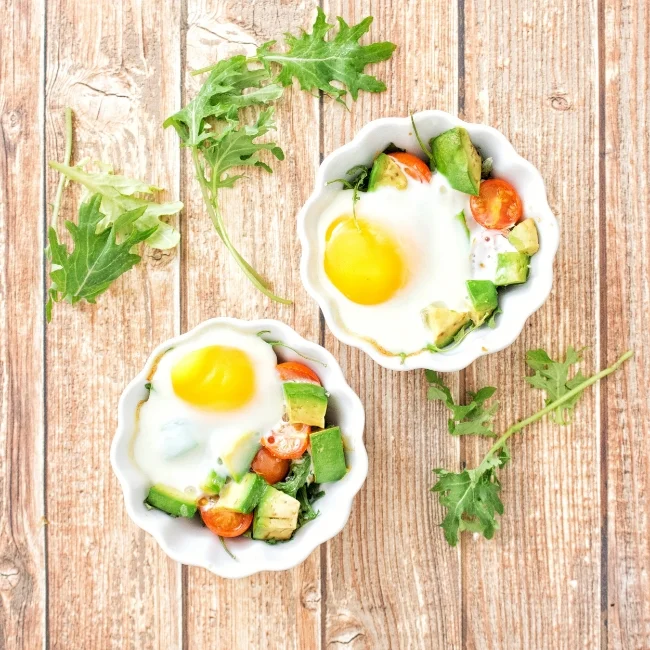 1. Preheat oven to 425 degrees. In 2 small ramekins, add arugula, cherry tomatoes, and diced avocado. Top with an egg.