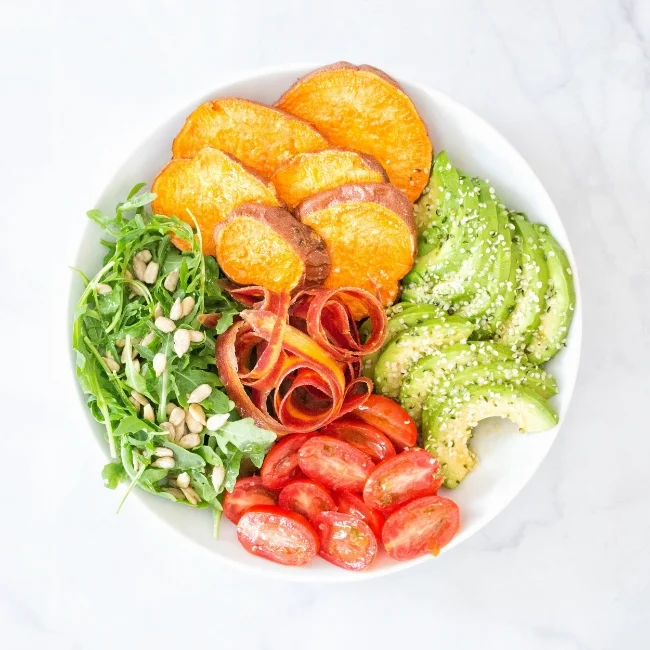 3. When sweet potatoes are ready, add to the bowl. Using a peeler, shave the carrot, and add to the middle of the bowl. Slice avocado and add as well. Follow with plum tomatoes and arugula.
