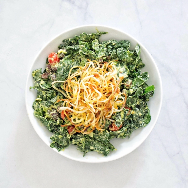 Kale Black Bean Salad With Avocado Jalapeño Dressing And Crispy Potatoes