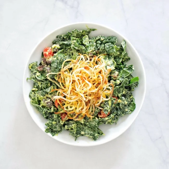 Salads always taste better with shoestring fries, and there's no reason you can't make them at home. With your spiralizer, you can make thin, crispy potatoes in the oven. This kale salad is creamy and spicy and inspired by Mexican flavors.
