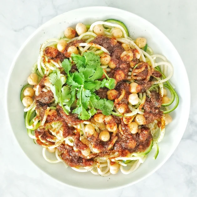 7. Noodles and Zoodles with Harissa, Chickpeas, and Parsley