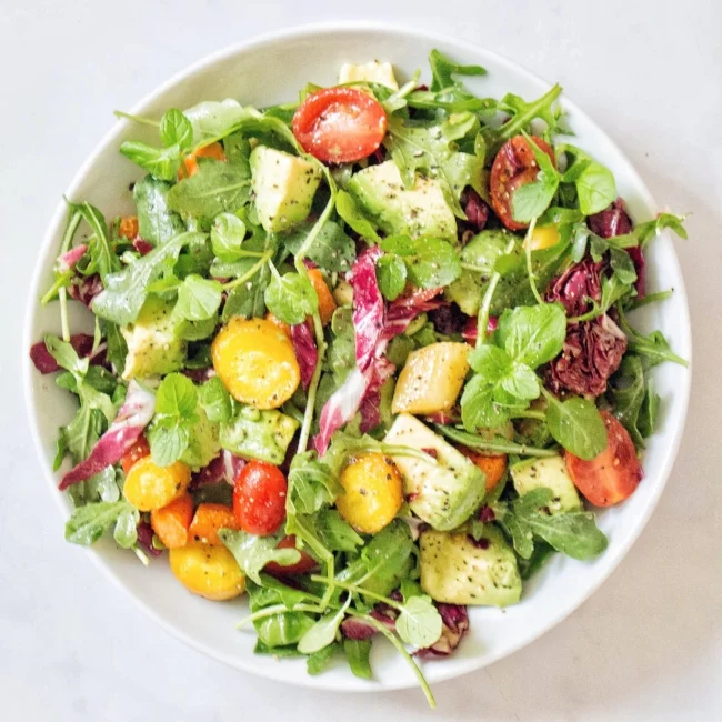 2. In a medium bowl, add arugula, radicchio, tomatoes, and avocado. When carrots are ready, add to the bowl.