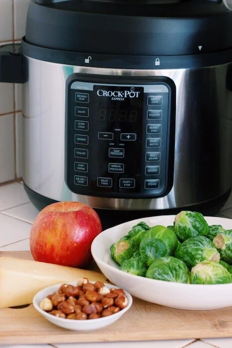 Crispy Pressure Cooker Brussels Sprouts with Apples, Hazelnuts and Gouda