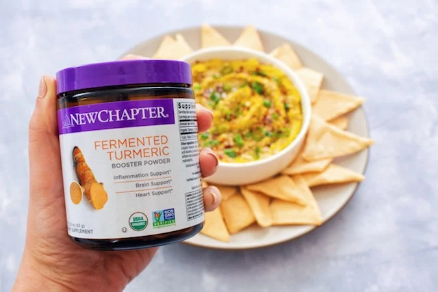 I am a big hummus person, and I’ve found that making my own hummus at home is so much better! I’ve also found that I can actually enjoy the flavors of turmeric when it’s mixed into something like a hummus. Adding the turmeric booster powder is very easy, and it also adds a really great subtle flavor to the hummus. This is going to be a staple in my household moving forward. Serve it with pita chips or carrots, or even add it to your salad for added nutrients.