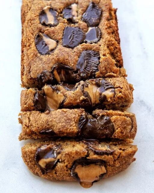 5. Pour batter into the loaf pan. Bake for 25 minutes, remove from the oven, and add the remaining peanut butter cups on top. Bake for another 20 to 30 minutes until banana bread is golden on top or until a toothpick comes out clean. Let cool before slicing.